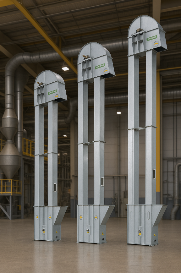 Elevatori a tazze serie “E” per trasporto verticale di materiali sciolti (cereali secchi e umidi, semi, farine): struttura modulare, tazze in polietilene antiusura e gruppo motore compatto per portate elevate e manutenzione semplificata.